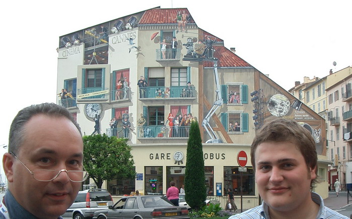 Украшением города являются фрески на глухих стенах обычных домов. Говорят, что их много, но мне встретились только две. Одна из двух мною замеченных была отчасти и рекламоносителем — содержала телефон конторы, в которой можно заказать украшение дома в этой технике — живопись по сырой штукатурке. Поскольку Канны — город южный, сезонные перепады погоды такой уличной живописи почти не страшны.