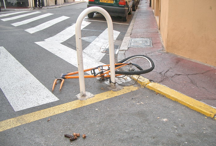 И на фоне всего этого великолепия и нескончаемого праздника на одной из многочисленных автостоянок, рядом со сверкающими машинами обнаружил я прикованный к ограждению разграбленный велосипед. Точнее — останки велосипеда. И решил сфотографировать это печальное зрелище. Проходивший мимо респектабельный француз с искренней горечью заметил: «Для нашего города это типичная картина». «Да, — подумал я, — есть еще недоработки у Каннского горисполкома».