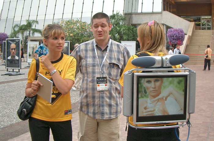 Такие промо на фестивалях устраивают спонсоры. Несколько бригад одетых в желто-черные костюмы девушек (БиЛайн тут не при чем) с видеоэкранами за плечами присутствовали и на территории Дворца фестивалей, и перед ним, и на всех вечеринках, приглашая принять участие в игре. Нужно было угадать закодированное в картинках слово. Что рекламировалось, я так и не понял, но одна из бригад промо-девочек оказалась русской. Они помогли мне сыграть в игру и угадать слово и отправили за призом — майкой в какой-то бар. Дошел до бара — он оказался закрыт — не всегда везет с халявой.