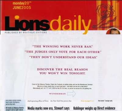 Один из выпусков Lionsdaily был снабжен издевательской по отношению к конкурсантам суперобложкой с их же характерными высказываниями: «Реклама, побеждающая на фестивалях, никогда не работает». «Жюри награждают только друг друга». «Они не понимают наших идей». Так фестиваль приглашал на дискуссию о проблемах креатива. Посещение семинара гарантировало, что слушатель «Узнает истинные причины, почему он сегодня не победит».