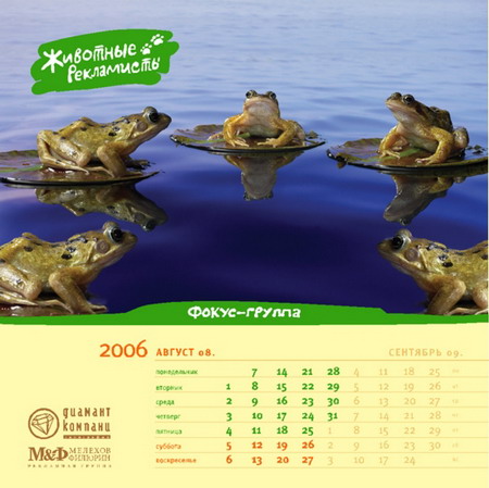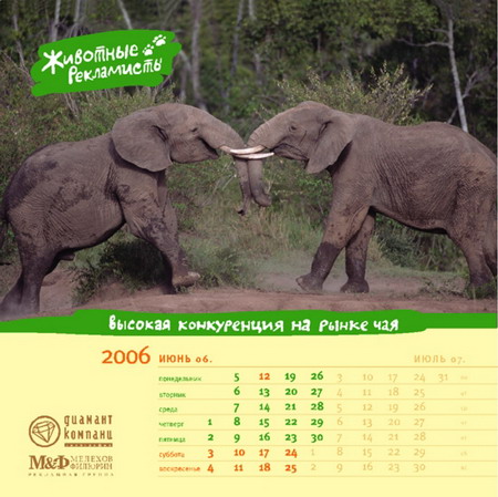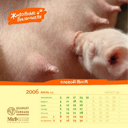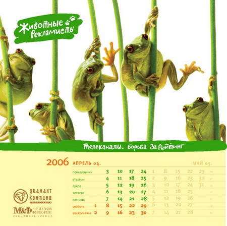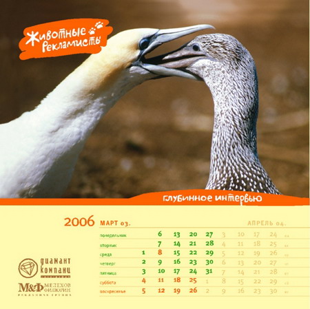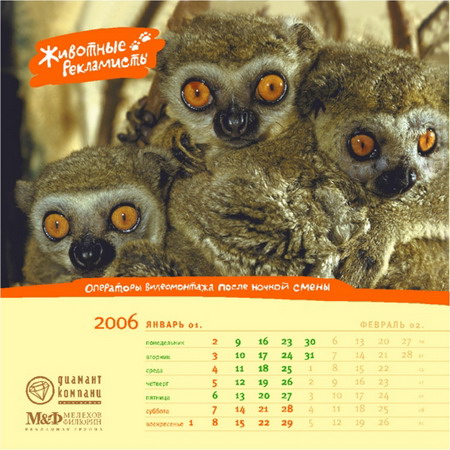 Разработка календаря дело долгое. Вот и этот мы тоже начали разрабатывать еще в начале 2005 года. Как всегда, придумывали календарь про рекламу. Обсуждалось несколько идей, в том числе и «Животные-рекламисты». По конторской (БРД) традиции идеей считается собственно идея плюс две шутки. К «Животным» в качестве дебютных шуток были предложены «Заказчик с севера», «Гнида», «Акулы» и еще что-то, не вошедшее в окончательную версию. Потом были исследованы запасы Фотобанка и придумано еще около 20 картинок.