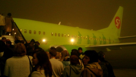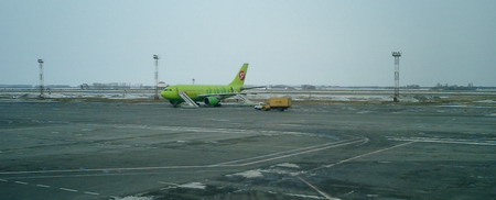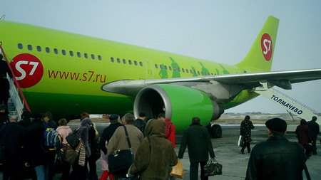 Значительная часть самолетов уже перекрашена. Даже на промозгло-заснеженном летном поле Толмачева их легкомысленные зеленые туши смотрятся оптимистично. Обычными пассажирами, как я заметил, это воспринято с одобрением.
