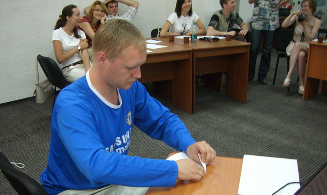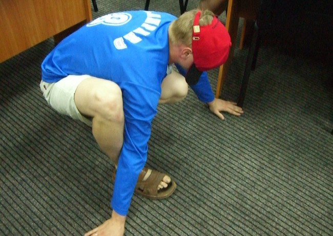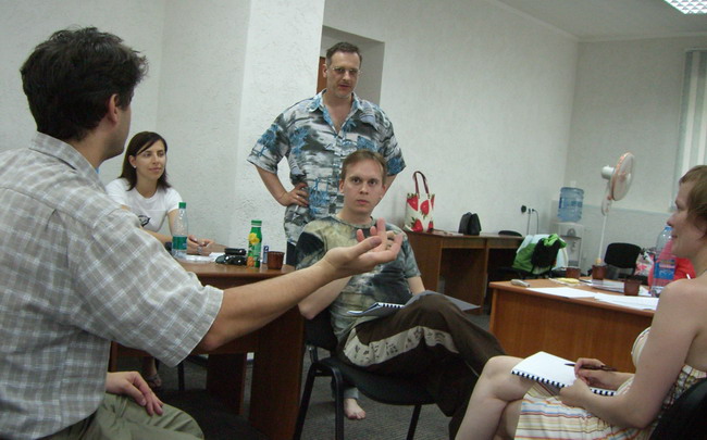 Для иллюстрации методик стимулирования Олега заставили вслепую ползать по полу. Хорошо, что там было ковровое покрытие.