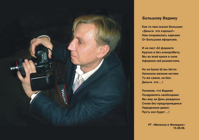 Календарь не бог весть какой креативный и расходился он небыстро. Пока мы не рассказали Вадику, что на большой букве Ш микрошрифтом напечатано «Деньги — это просто за***сь!». Миша Васильев так похулиганил. После этого все, получившие календарь в подарок, начали искать и находить эту фразу и тираж разошелся мгновенно.