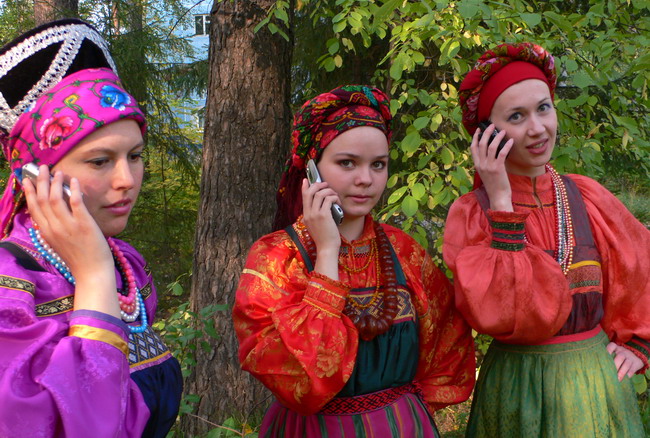 Мобильные телефоны на этом снимке не аутентичные. Во второй половине 19-го века среди российских крестьян были популярны другие модели.