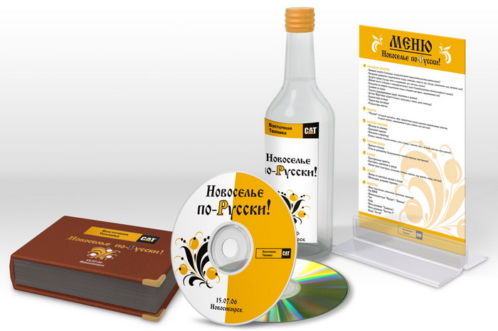 Для «Новоселья по-русски» мы взяли стилизованные русские узоры «под хохлому» и оформили приглашения, меню и даже этикетки на водку в корпоративных цветах Caterpillar — черно-желтых.