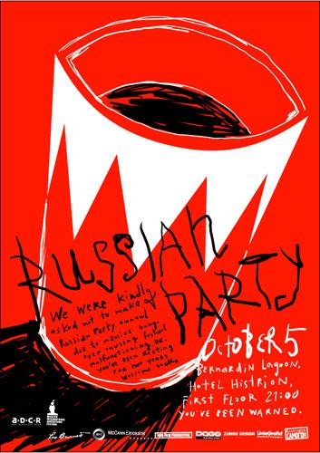 Я уже говорил, что наших дизайнеров хлебом не корми, дай что-нибудь кривенько написать. У них это называется оригинальный рукописный шрифт, и они от этого испытывают множественный консенсус. Вот вам очередной пример — плакат русской вечеринки.