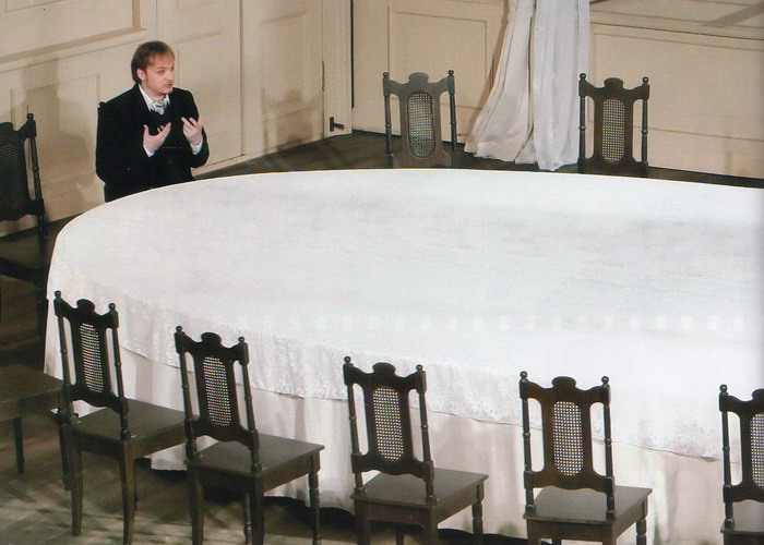 Большой театр сегодня представил новосибирцам лирические сцены в перелицовке некоего Дмитрия Чернякова. Чернякову традиционным способом ставить оперу было неинтересно и он решительно все изменил. Все действия у него происходят в одном и том же зале, вокруг большого овального стола.
