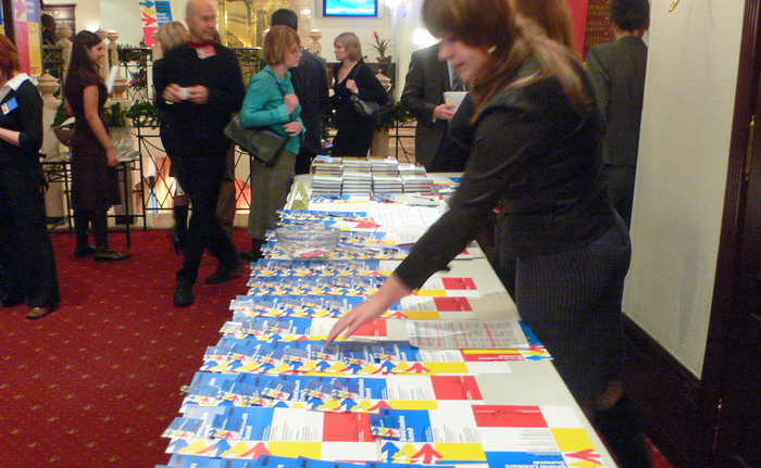 «Саммит Брендов Лидеров» проходил на этот раз в Мариотте на Тверской. Название у этой конференции по брендингу излишне пафосное, впрочем, и гостиница выбрана тоже пятизвездочная. Зато комфортабельно и не стыдно больших людей приглашать. У Маши Хохловой все хорошо организовано. Девочки раздают бэджики, книжки лежат в стопочках, на столиках угощение.