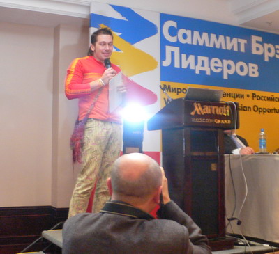 Но свой вопрос я задать не успел, потому что на подиум вышел Евгений Чичваркин, освещаемый вспышками фотокамер. Как и на прошлогоднем докладе в этой аудитории, одет он был вполне креативно.