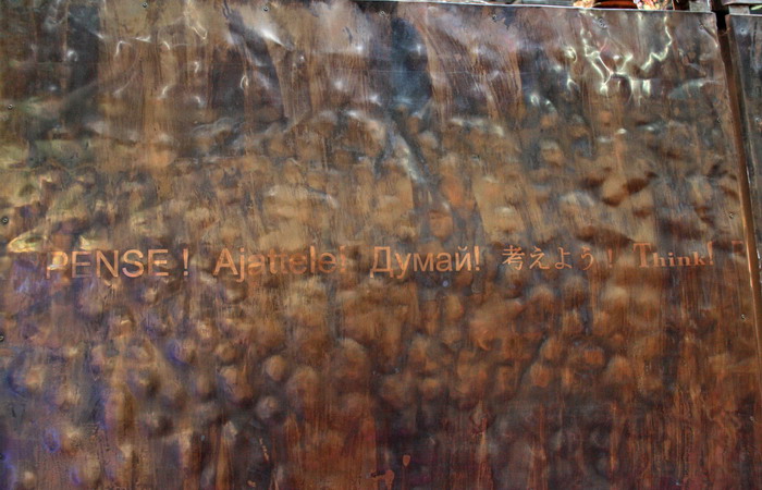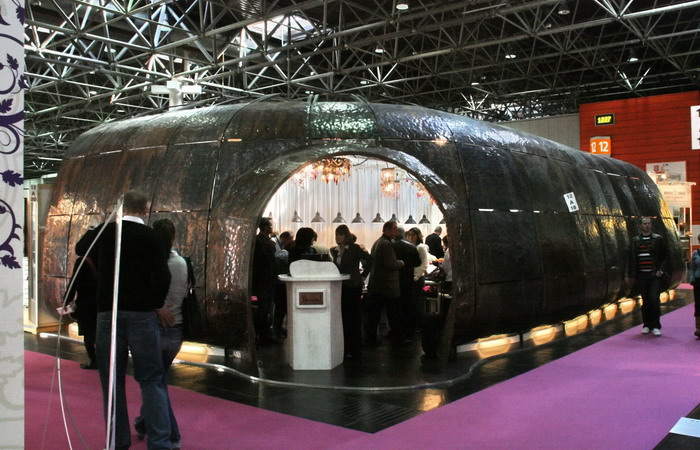 Оригинальный стенд у марки Think!. Что-то вроде медного чума с интернациональным текстом, выгравированным на боках.