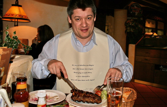 А еще мне там выдали специальный фартучек (или слюнявчик?), чтобы я, предавшись чревоугодию, ненароком не запачкался. Очень удобно. Почему в наших ресторанах таких не выдают? Я бы с удовольствием!
