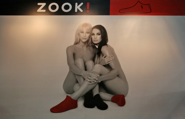 На плакате марки ZOOK! модели обнажены и переведены в черно-белый вид. Одним выстрелом двух зайчиков! И взгляд привлекает и цветные тапки выгодно поданы.