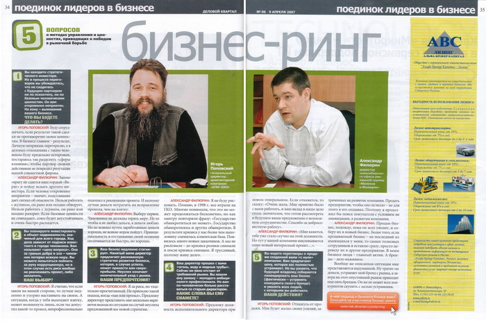 В 36-м номере журнала «Деловой квартал» в рубрике «Бизнес-ринг» вышло спаренное интервью. Одни и те же вопросы были поотдельности заданы мне и Игорю Поповскому, директору архитектурной компании. Вопросы каверзные, с подковыркой, типа «Перестал ли ты пить коньяк по утрам?». По замыслу журналистов подразумевалась разность позиций и некоторая дискуссионность в ответах. Вот что получилось.