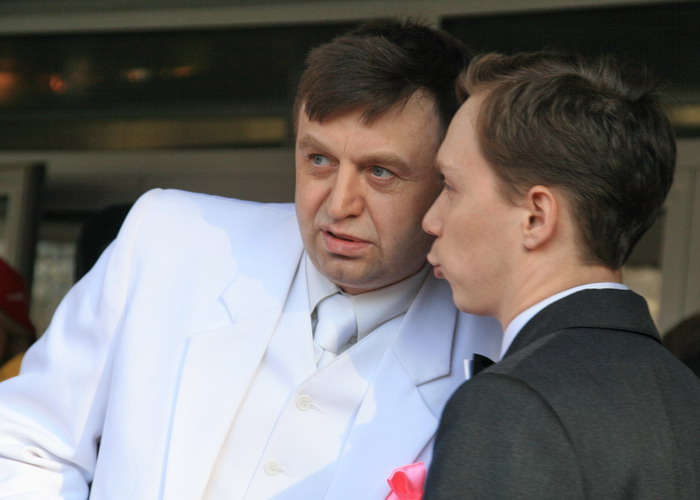 Наконец, одно за другим начали подъезжать транспортные средства, актеры под стрекот фотокамер проходили по красной дорожке и поднимались в Дом Ученых. Вова Дуда вел всю церемонию, а Миша Гусев брал у них короткие интервью.