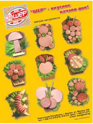 Сегодня пришло письмо со ссылкой на бишкекскую газету «Витрина». Там напечатана реклама, несколько похожая на наш плакат двухлетней давности, сделанный для «Бутербродницы». Вообще-то, ребята — молодцы, сильно развили и обогатили сюжет. Видно, что они не обделены фантазией. Но вот лозунг можно было бы и поменять.