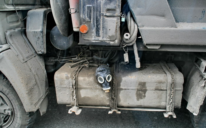 Мне неоднократно случалось наблюдать противогаз, повешенный на лючок бензобака грузовика. На этот раз даже сфотографировать удалось. Видимо, у водителей самосвалов есть своеобразная мода на оформление своих механизмов.