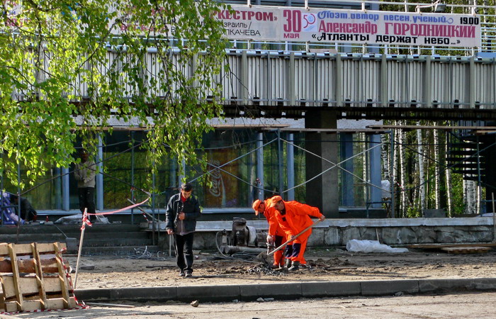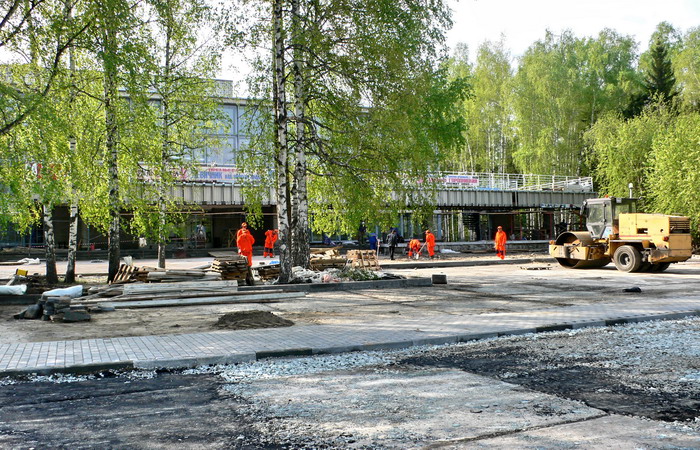 Уже две недели перед Домом Ученых идет бурная работа. Площадка мостится, асфальтируется и облагораживается. Скоро у Сибирского Отделения будет юбилей, приедет Путин, Иванов или Медведев и перекроют все дороги. Надо успеть.