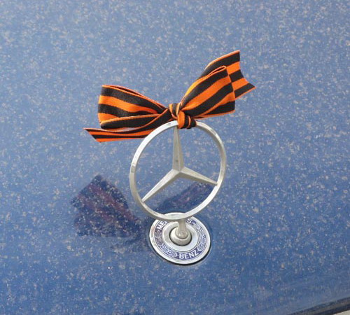 Ирония судьбы заключается в том, что ездим мы в основном на японских и частично на немецких автомобилях, то есть на продукции стран, разгромленных нашими отцами и дедами во Второй Мировой Войне. Олег Гущин предложил повязать ленточку на Mercedes, как символ немецкого автопрома, и сфотографировать, чтобы было смешно. Но нас опередил Константин Пономарев. Молодец Константин!