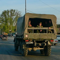 Приближается День Победы. На дороге начинают попадаться грузовики с солдатами. Эти парни заметили, что я их фотографирую и заулыбались. Молодые еще.