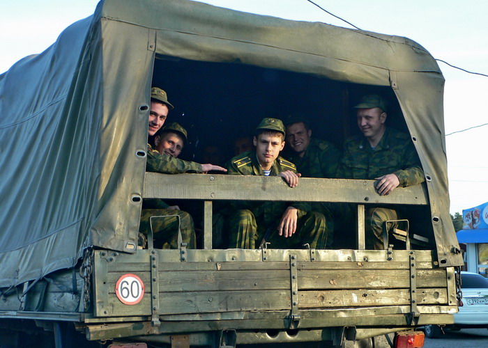 Приближается День Победы. На дороге начинают попадаться грузовики с солдатами. Эти парни заметили, что я их фотографирую и заулыбались. Молодые еще.