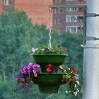 В заметке Верхушечное озеленение я уже рассказывал о подвесных клумбах, которые устанавливают наши городские озеленители. А сегодня обнаружил подвесные горшки на фонарных столбах.