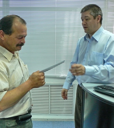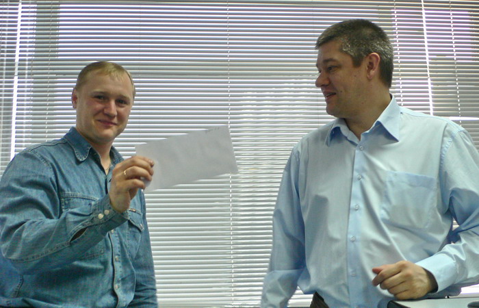 Нам потихоньку стукнуло 15 лет. Шумно мы это дело не праздновали, так, провели вручение значков и раздачу премий. Сначала вручали золотые значки тем, кто отработал в компании 7 лет. Их получили Лидия Ивановна, Олег Гущин и Наташа Соловьева.