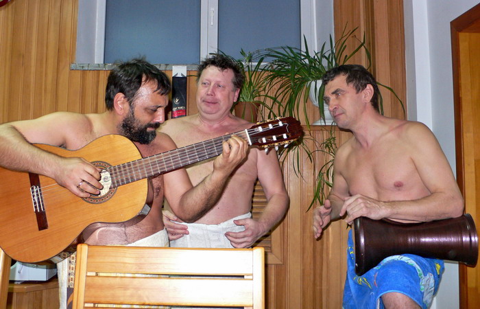 В бане мы продолжили отмечать мое избрание в РАР (Российскую Академию Рекламы). По такому случаю Андрей Брызгалов принес гитару, а Володя — дарбуку. И они исполнили в мою честь песню про коричневую пуговку. Почему именно ее — никто не понял, но все стали подпевать.