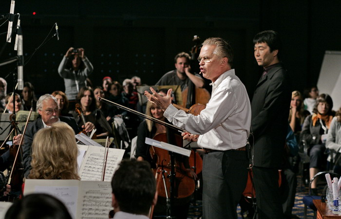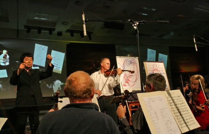 Потом он нарисованное исполнял на скрипке и, что интересно, оркестр, руководимый молчаливым японцем Ёницу Тошихиро, успевал вступить и сопроводить солиста. Тошихиро был скуп на эмоции, по-самурайски невозмутим и, вообще, являл собой полную противоположность энергичному солисту.