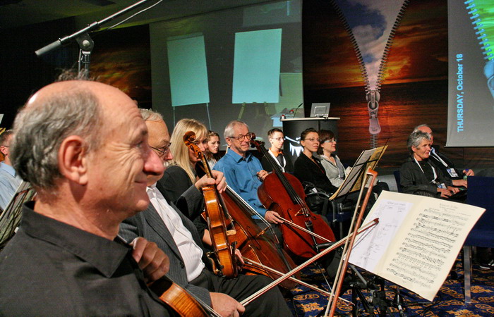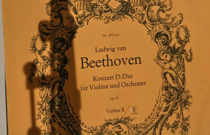 После обеда состоялось мероприятие, анонсированное как The sound of Creativity and Innovation. На самом деле это был симфонический концерт, но не совсем обычный. Стулья в зале были расставлены полукругом, на них сидел симфонический оркестр, но было еще много свободных мест и солист Миха Погачник (скрипка) энергично призывал всех садиться рядом с музыкантами. Ну, я и сел аккурат между вторыми скрипками и альтами, рискуя получить смычком в глаз. Соответственно, справа сзади находились деревянные духовые и ударные, а слева — медные. Судя по нотам, они собирались исполнить ремажорный концерт Бетховена для скрипки с оркестром.
