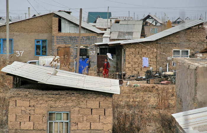 Во многих областях Киргизии отсутствует работа, в поисках доходов их жители переселяются поближе к столице, захватывая колхозные земли вдоль дороги. Мы проехали несколько таких поселков, построенных из саманного кирпича. Он делается из необожженной глины с примесью соломы, мякины и даже навоза и почти ничего не стоит. Глинобитные постройки не заряжают оптимизмом.