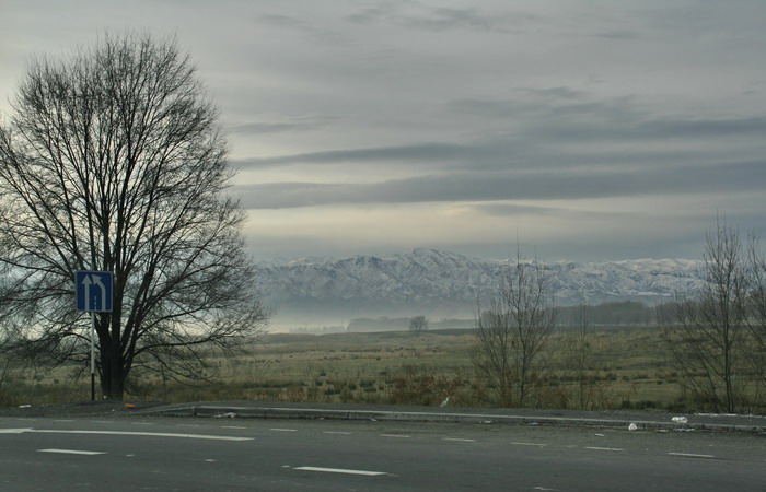 В трехчасовом путешествии нам систематически встречались три вещи: заснеженные вершины гор, пасущиеся стада и портреты Назарбаева. Вообще-то, горы появились на горизонте, когда мы еще ехали по Алма-Ате. А когда выехали — мы все время двигались вдоль горной гряды. Казалось, что она находится совсем недалеко от дороги, рукой подать, но Мурат сказал, что это иллюзия, что на самом деле до отрогов 20 километров. Поэтому в горы мы не поехали.