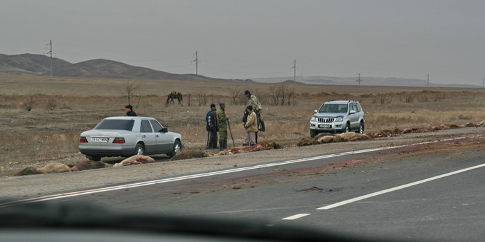 В одном месте видели место массовой гибели овец. Видимо, водитель на большой скорости въехал в отару, переходившую дорогу в неположенном месте. Ба-р-раны, что с них взять! Мурат сказал, что одна взрослая овца весит 30 килограммов и стоит около 100 долларов. Я прикинул, что овец задавили на 3 штуки баксов. Какая нелепая смерть! Сколько шашлыка, бесбармака и лагмана пропало!