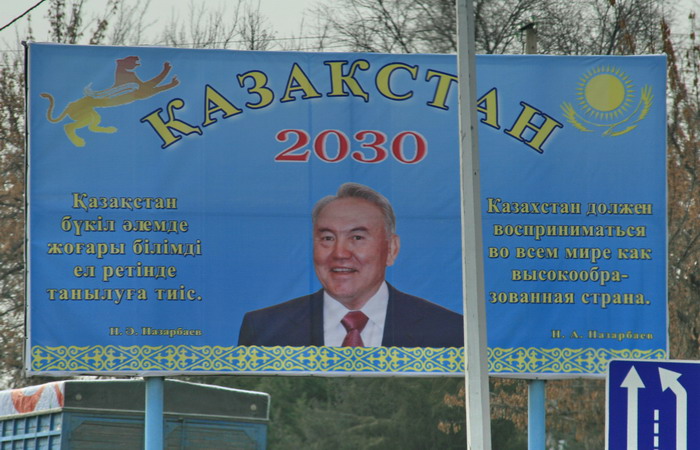 Надо отметить, что наглядная агитация в Казахстане поставлена очень хорошо. Единой России стоит поучиться у своего казахстанского аналога — партии Нур Отан. Но, чем дальше от столицы — тем меньше надписей на русском языке.