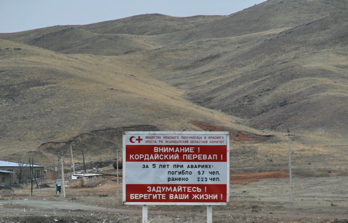 В пути нам довелось героически преодолеть Кордайский перевал. Он не очень высокий, но, как видно из таблички, довольно опасный. И, опять же, уши немного закладывало.