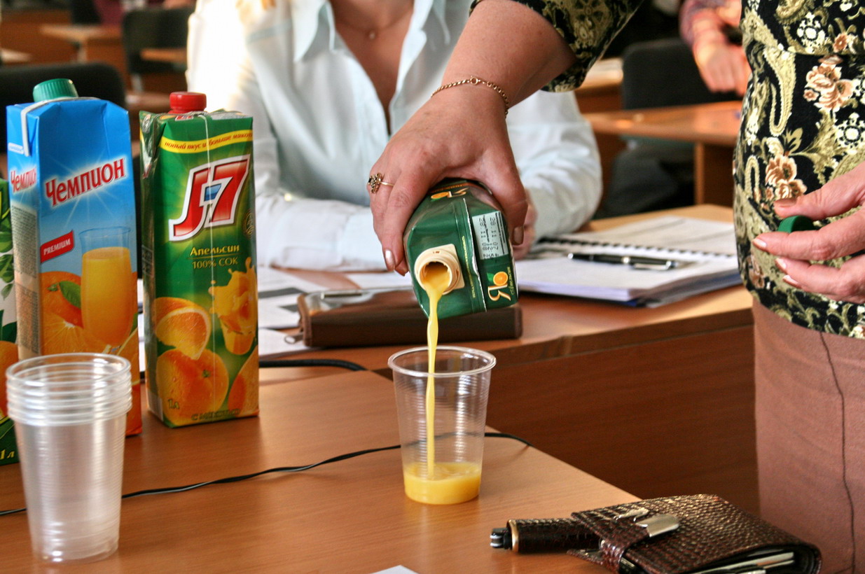 Елена Сергевна тоже разбавила свою лекцию дегустациями. Поскольку ее темой были исследования, она сделала их сразу два. Было проведено открытое и слепое тестирование четырех соковых брендов, принадлежащих, правда, к разным ценовым группам.