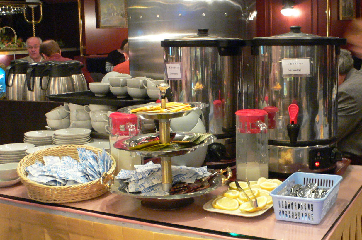 Шведский стол откровенно порадовал. Честно говоря, не ожидал от «Измайловской» столь богатого выбора. Все сделано, как в крупных иностранных отелях. Большой основной стол и отдельные столы с напитками, хлебом, десертами и фруктами. И отдельное место с поваром, который жарит яичницу. К сожалению, обнаружил его в последний момент. Из недостатков: темно и тесновато для такого количества едоков. За завтраком звучала музыка а ля дискотека 80-х. Вспомнил Юрия Антонова.